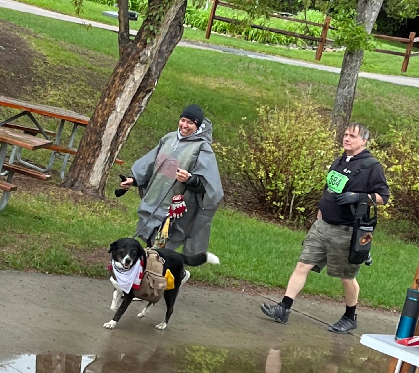 We had a great time, in spite of the rain. As happens every time we have a rainy year, the rain slowed down enough to give the runners a pleasantly cool day. Volunteers were probably chilly, but the runners were mostly comfortable!